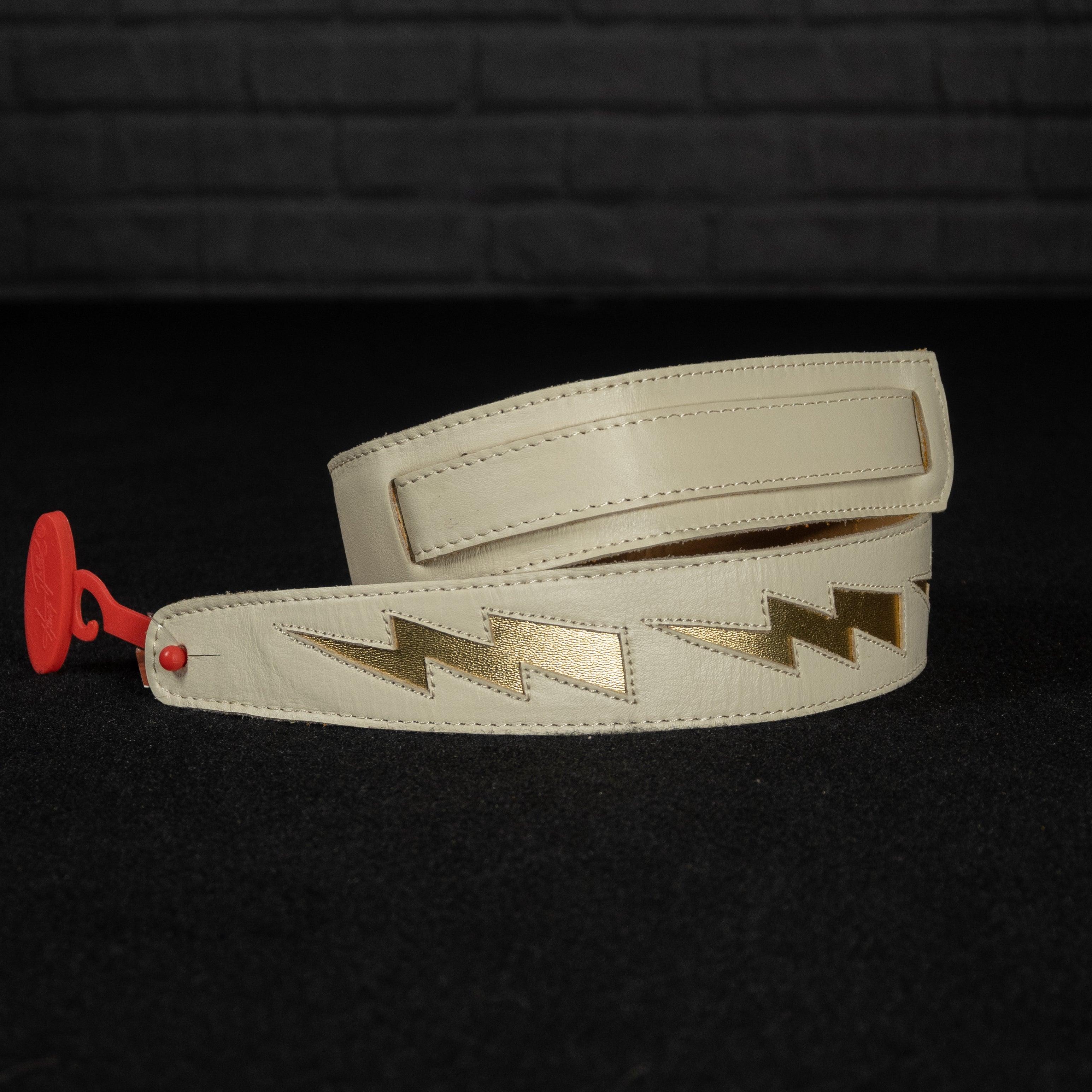 2" wide Henry Heller Capri leather with three patent leather repeating Bowiesque Bolts. Adjusts to a max length of 54". Small Batch & Handmade.