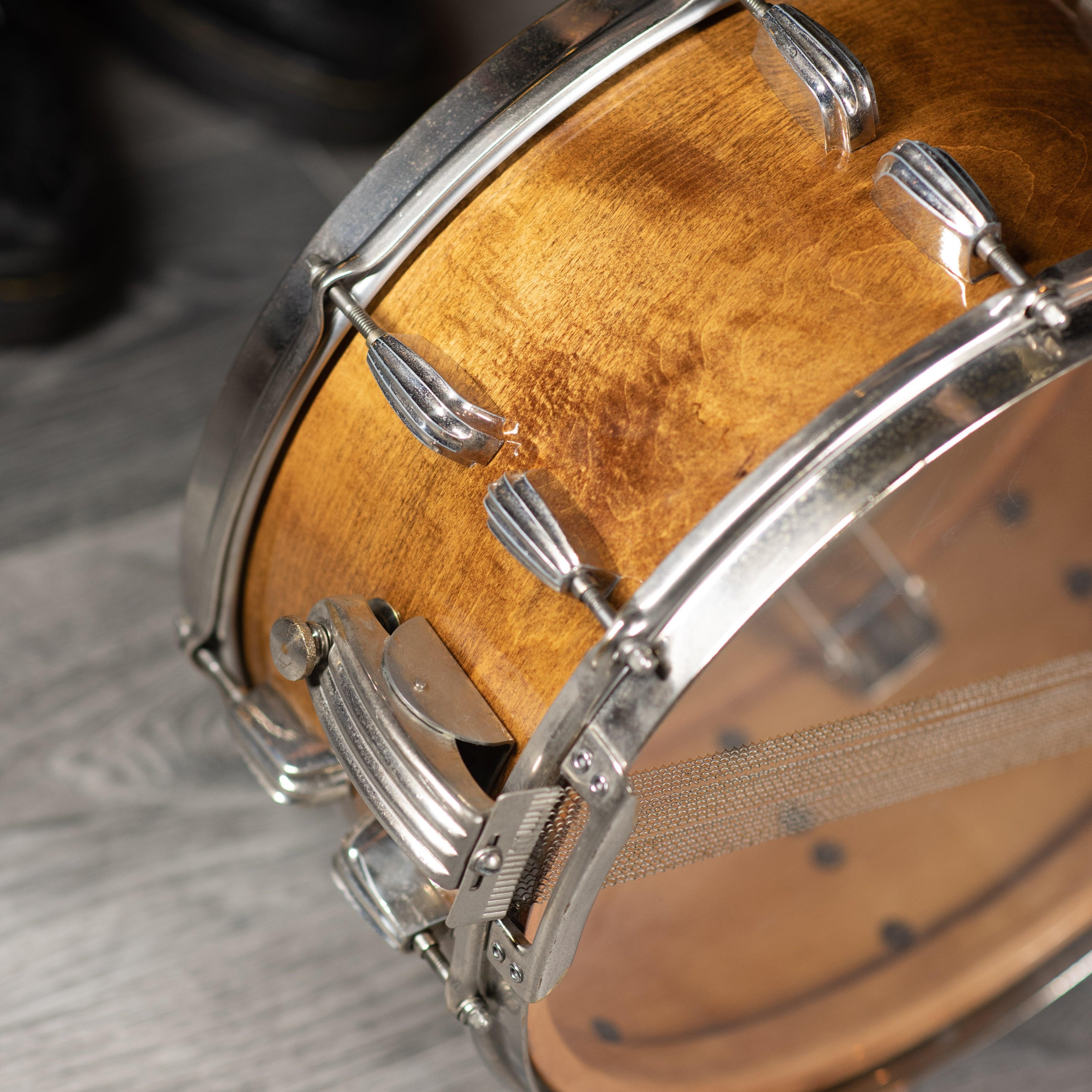 Authentic early 1940s snare drum up for grabs. This is a museum quality, one piece, solid, steam-bent maple shell that has an amazing sound. It has the orignal Slingerland "snappy" snare wires and functions perfectly. The hardware is nickel over brass. It is 7" tall x 14" deep. This is a very hard to find piece, adn we will probably only ever have this one!