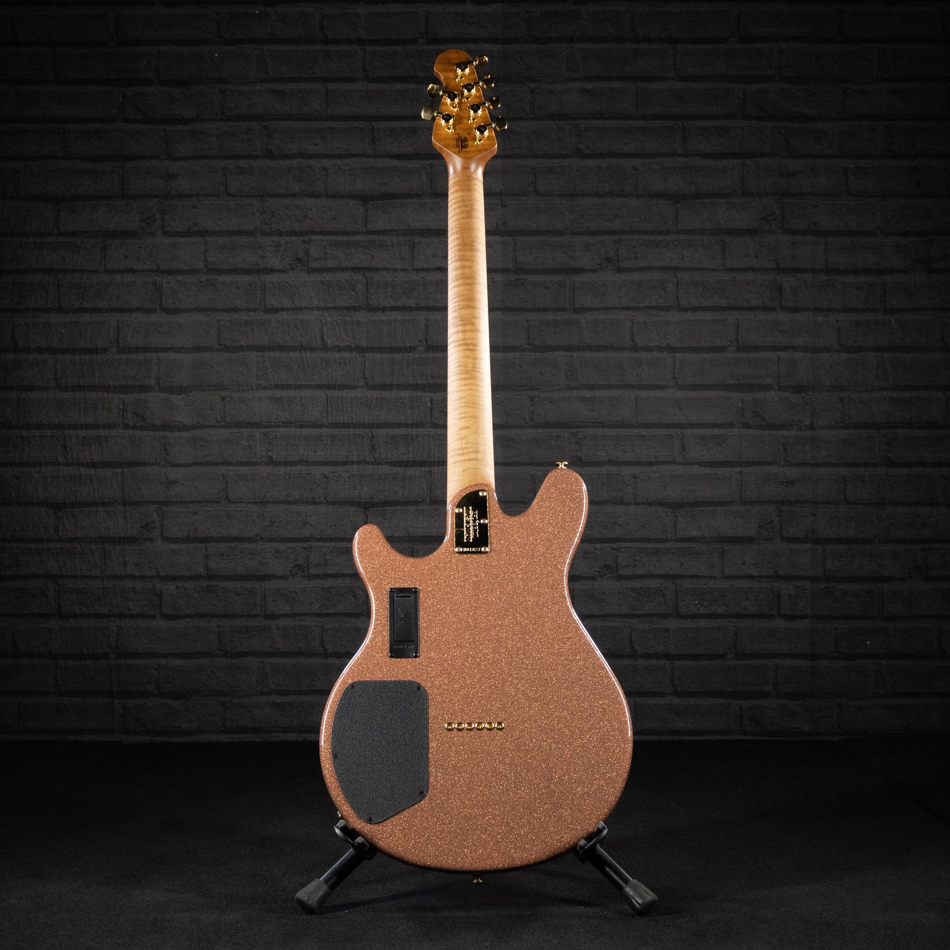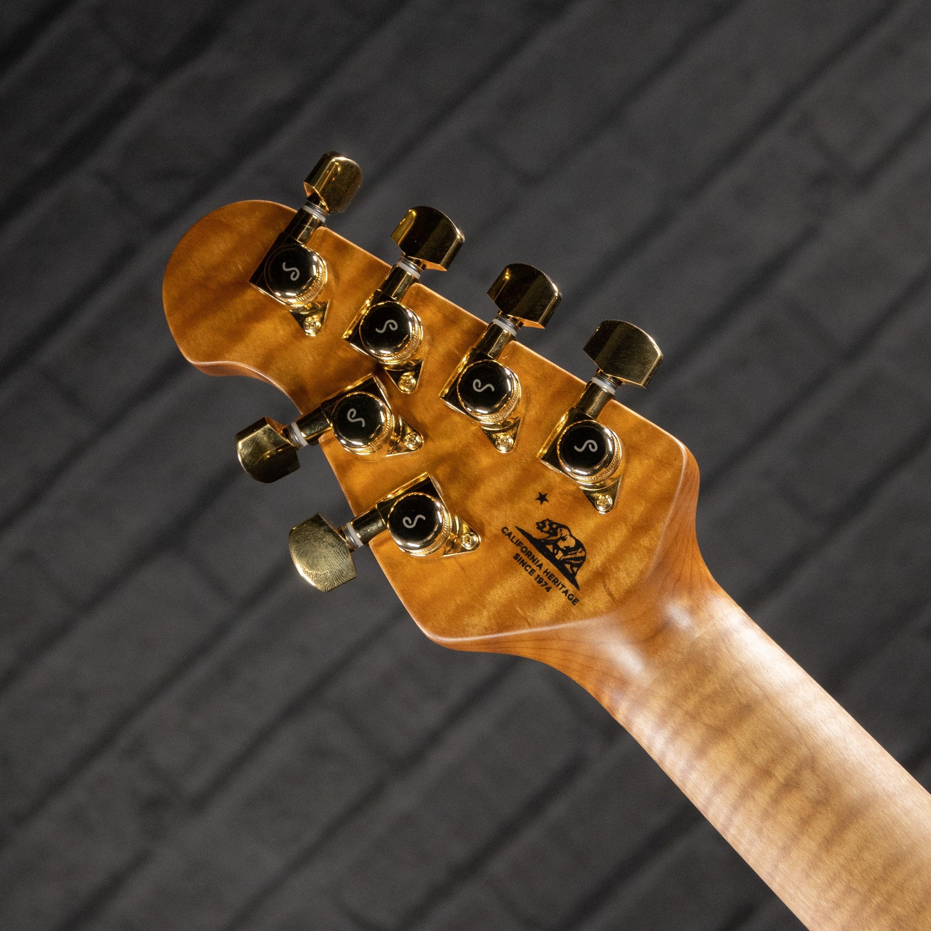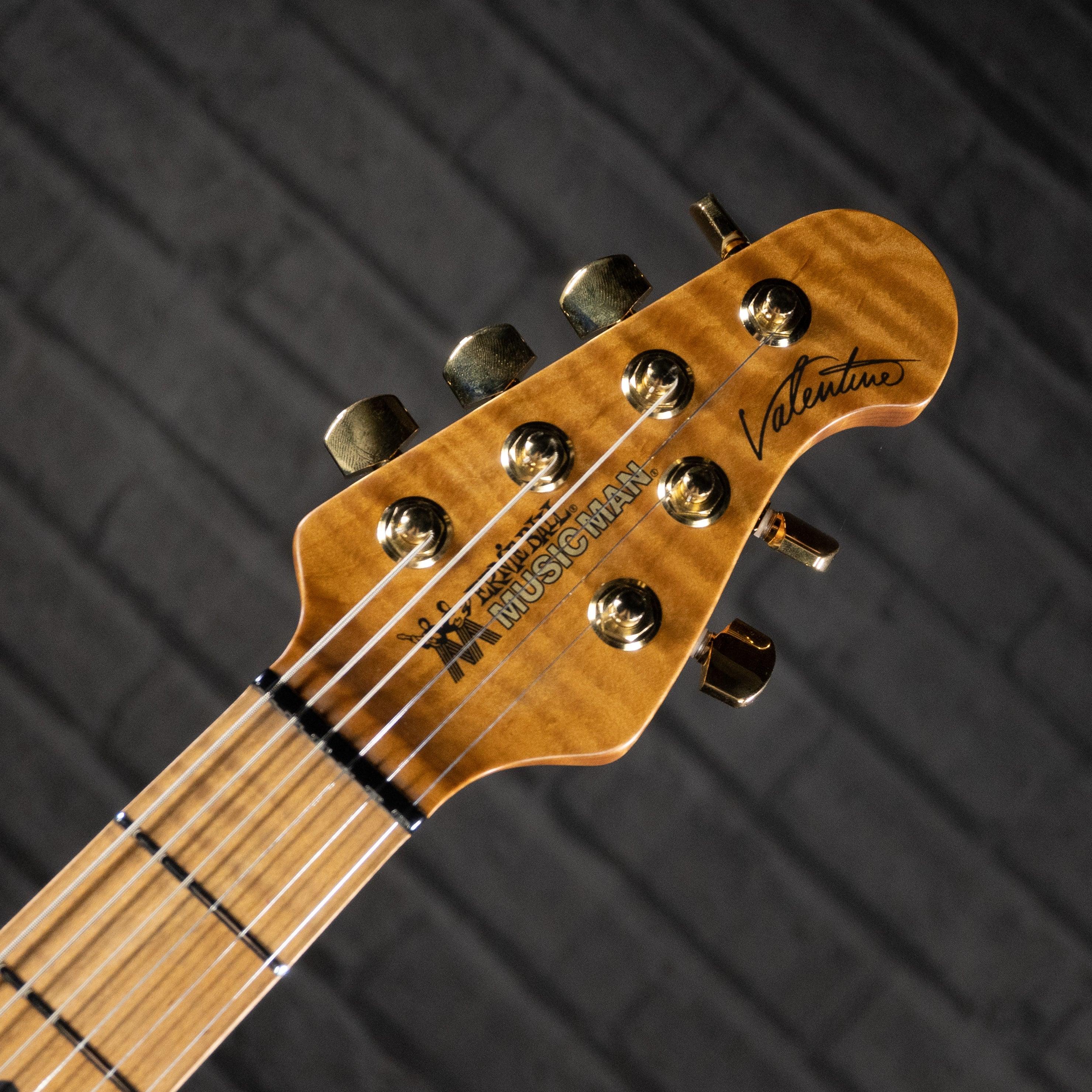 La guitarra Ernie Ball Music Man James Valentine "Valentine" cuenta con un cuerpo de losa de fresno, dos pastillas diseñadas por Ernie Ball Music Man (1 humbucker/1 bobina simple) con interruptor de palanca con cable personalizado de 3 vías, bobina dividida, moderno puente rígido con Monturas vintage de acero doblado, escala de 25,5 pulgadas, mástil de arce tostado frotado con aceite y cera con diapasón de arce de radio de 10 pulgadas, 22 trastes de acero inoxidable, clavijero de gran tamaño 4 sobre 2 y tuerca compensada, diseñado para una estabilidad de afinación superior.