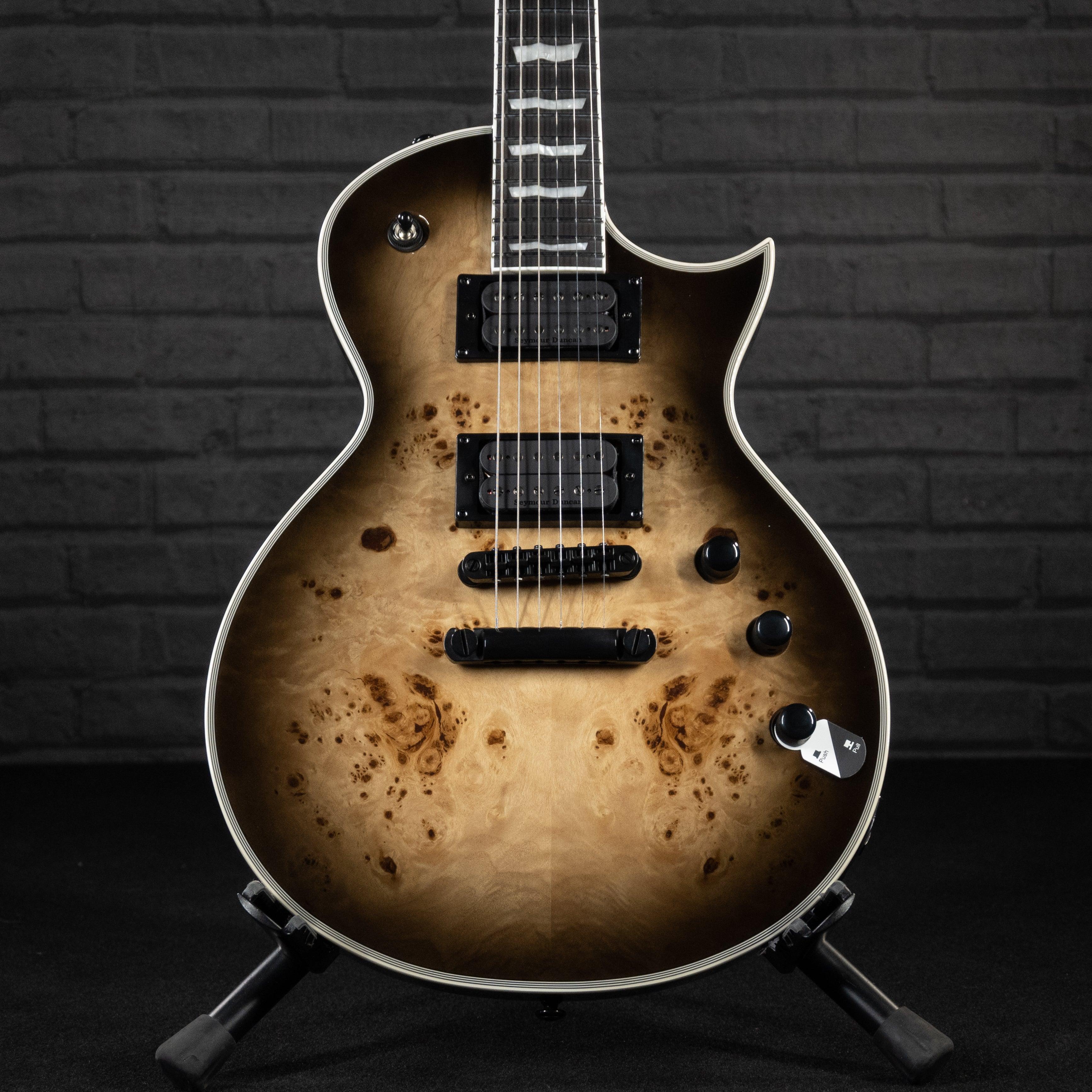 Las guitarras de la serie LTD 1000 están diseñadas para ofrecer el tono, la sensación, el aspecto y la calidad que los músicos profesionales que trabajan requieren en un instrumento, y la LTD EC-1000 se ha clasificado constantemente entre los modelos de guitarra más populares del mundo durante los últimos 20 años. ofreciendo la forma de guitarra de corte único de alta calidad diseñada para músicos serios a un precio que todos pueden pagar. Este excepcional EC-1000 ofrece una tapa de álamo nudoso sobre un cuerpo de caoba con un mástil de caoba de tres piezas y un diapasón de ébano de Macassar. Incluye un conjunto de pastillas pasivas Seymour Duncan Sentient (cuello) y Pegasus (puente) de alto rendimiento, que se pueden dividir mediante un control push-pull, para tonos alucinantes para metal, rock, fusión, progresivo y otros géneros. Incluye incrustaciones de bandera, encuadernación de cuerpo completo/cuello/clavija y componentes de primer nivel como afinadores de bloqueo LTD y un puente TOM de bloqueo TonePros y cordal.