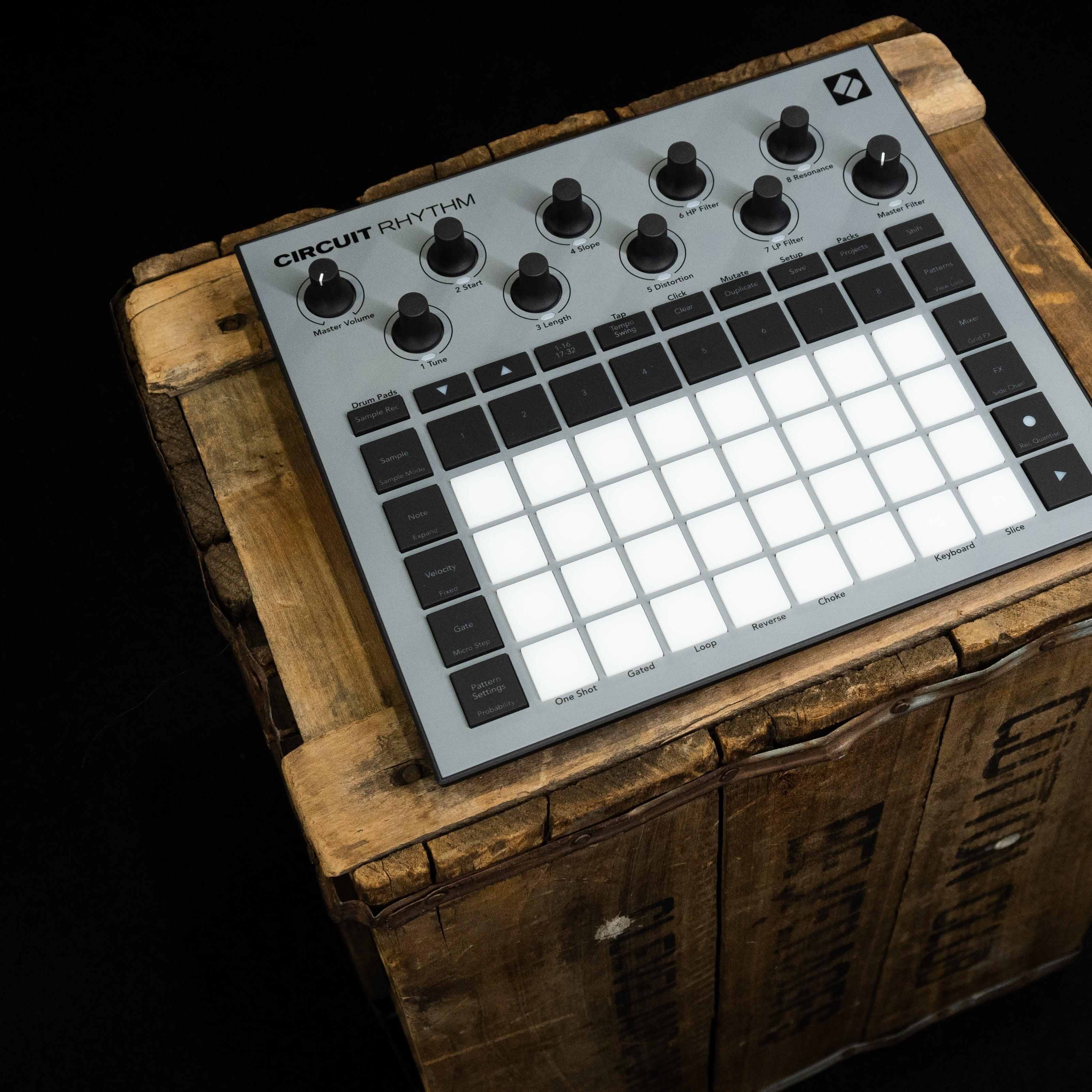 Circuit Rhythm es un sampler versátil para crear y ejecutar ritmos. Grabe muestras directamente en el hardware, luego divida, esculpe y vuelva a muestrear sus sonidos sin esfuerzo. Capture su ritmo cuantizado o fuera de la red en el secuenciador, y superpóngalo en ocho pistas de muestra. Revitalice su set en vivo con efectos de rendimiento: acepte la imperfección con cinta de baja fidelidad, tartamudee su mezcla con repetición de ritmo y más. Integre Circuit Rhythm en su estudio, o desconéctelo y cree en cualquier lugar utilizando la batería recargable incorporada.