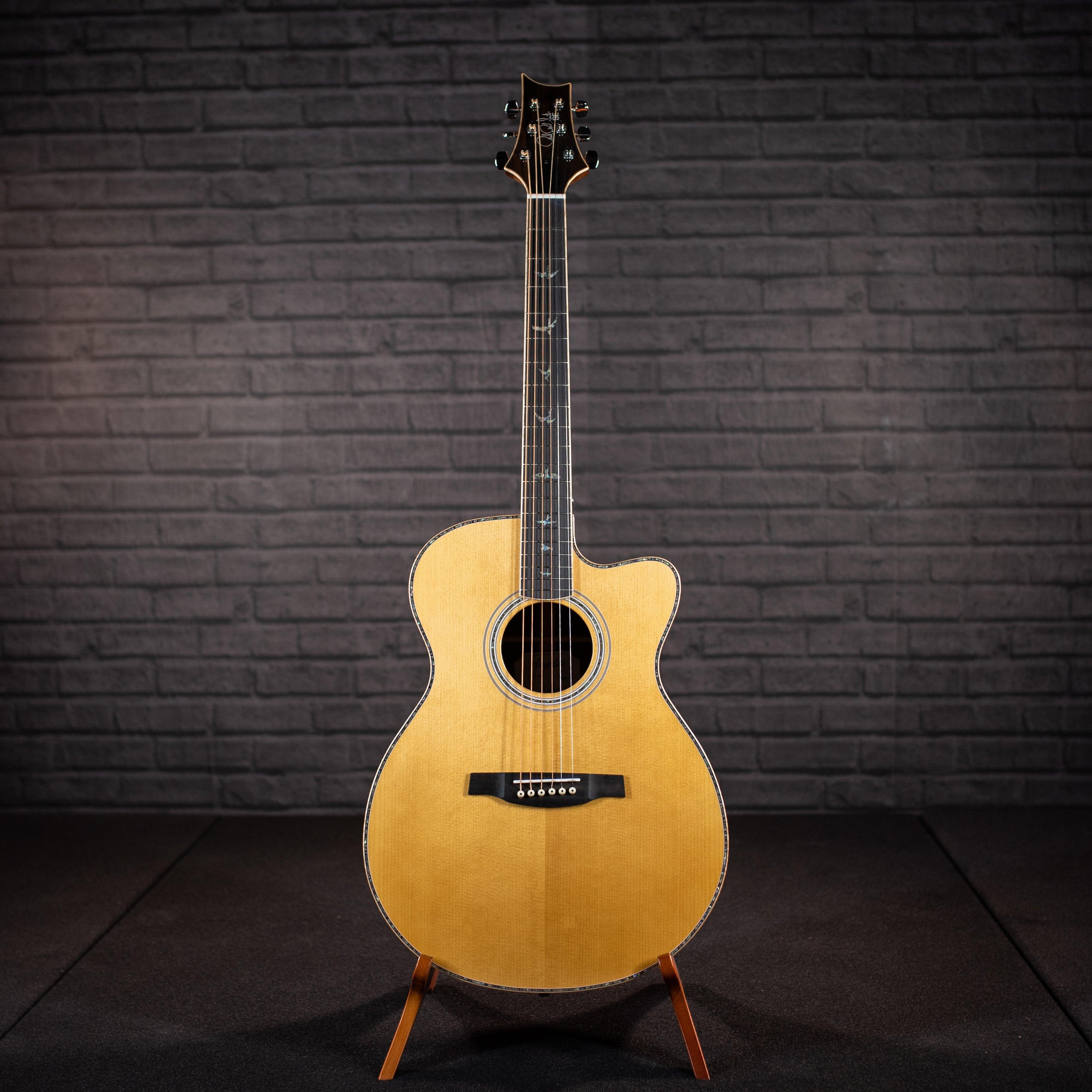 El SE A60E está bellamente decorado con acentos de abulón y arce labrado. Las características adicionales de alta calidad incluyen una tapa de abeto macizo, diapasón y puente de ébano, cejilla y montura de hueso, así como incrustaciones de pájaros de la marca registrada PRS y diseño de clavijero. Se envía con un estuche rígido de alta calidad.
