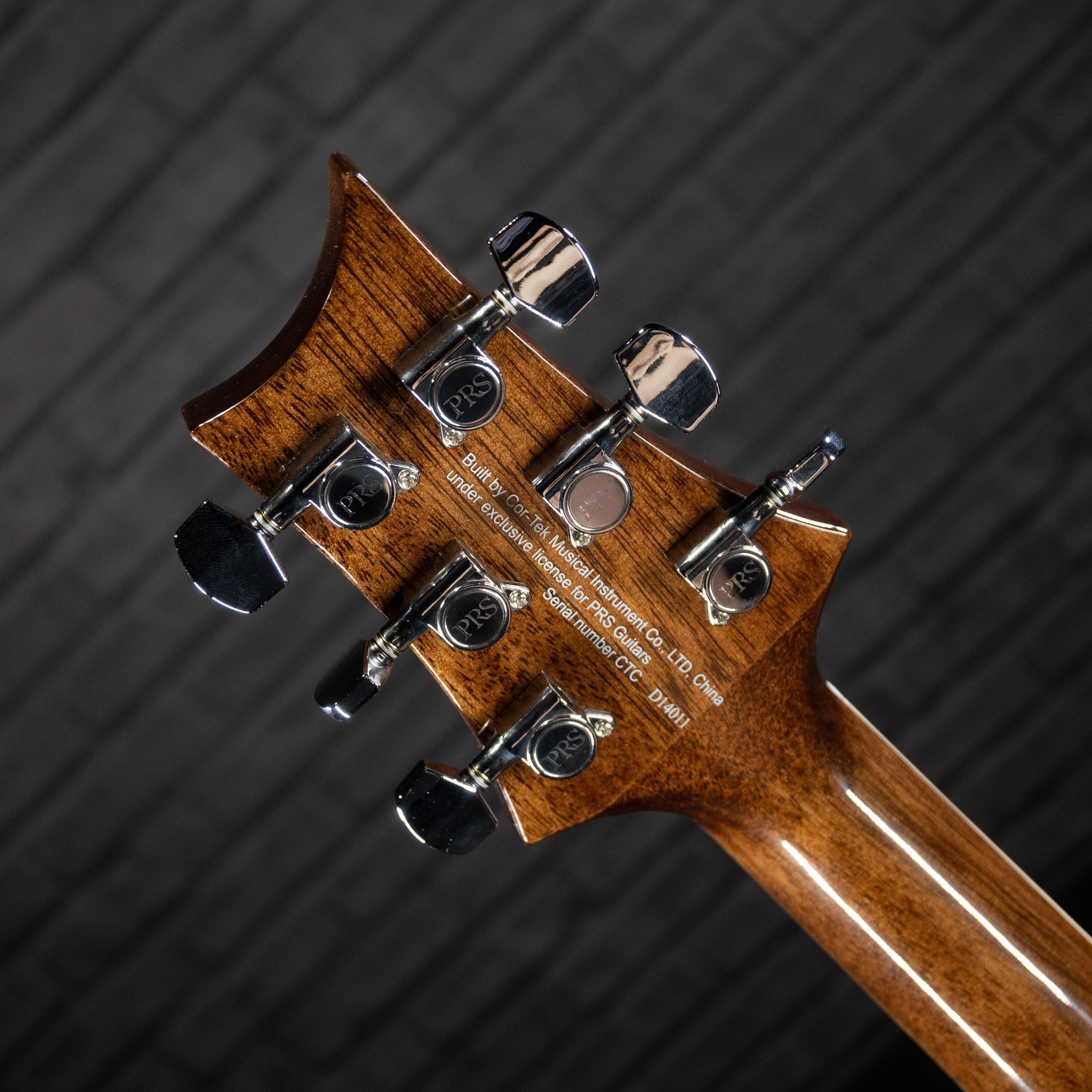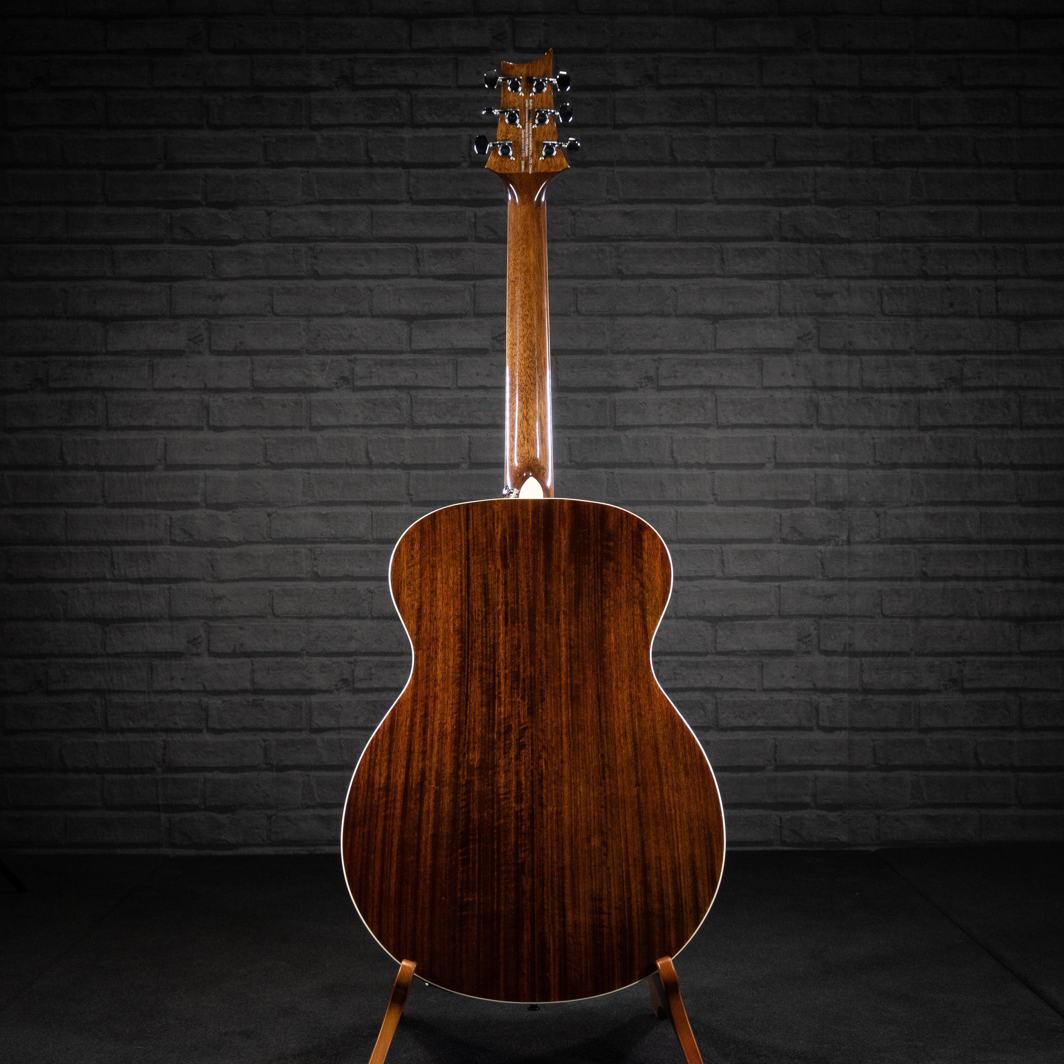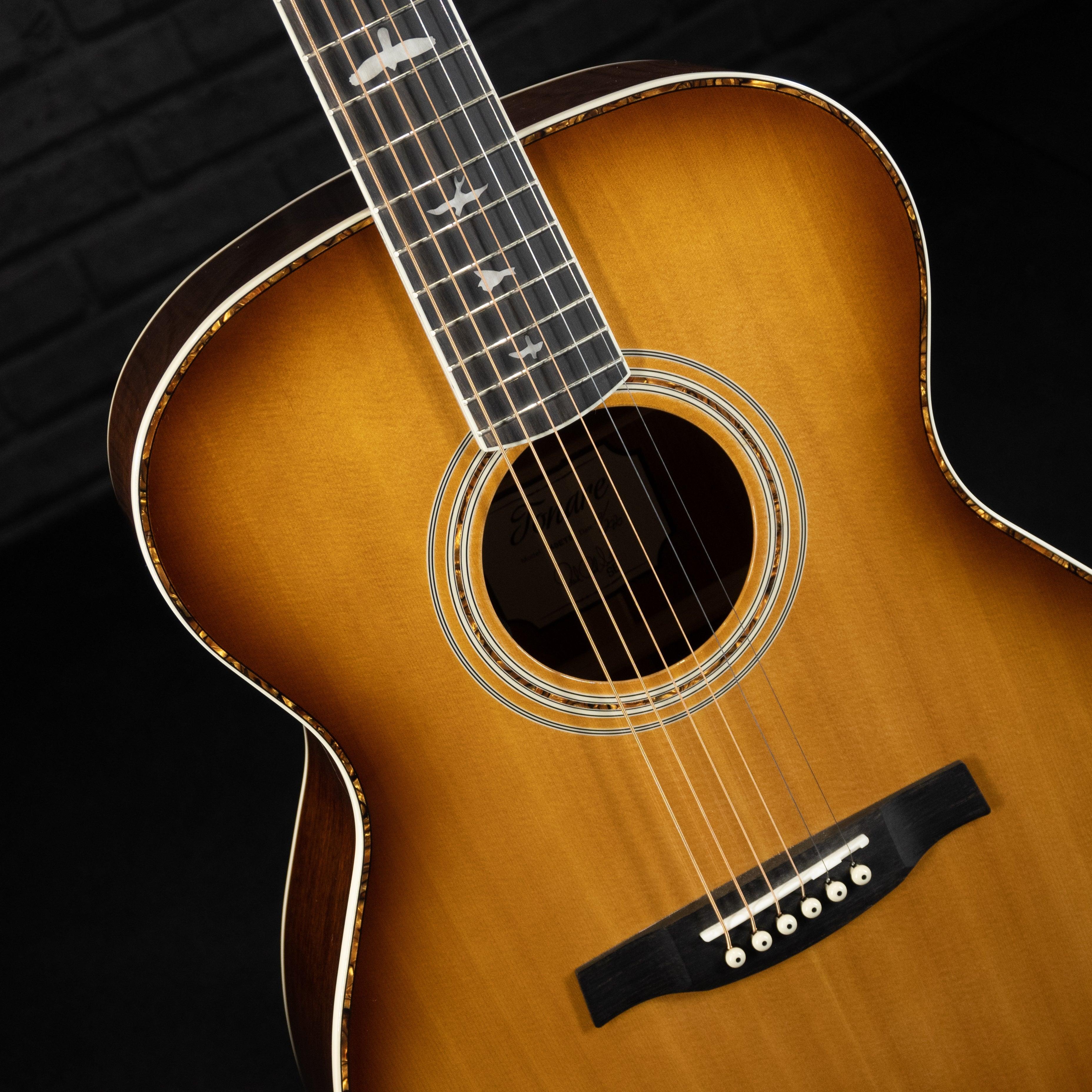 Las características adicionales de alta calidad incluyen una tapa de abeto macizo, diapasón y puente de ébano, cejilla y montura de hueso, así como incrustaciones de pájaros de la marca registrada PRS y diseño de clavijero. Se envía con un estuche rígido de alta calidad.