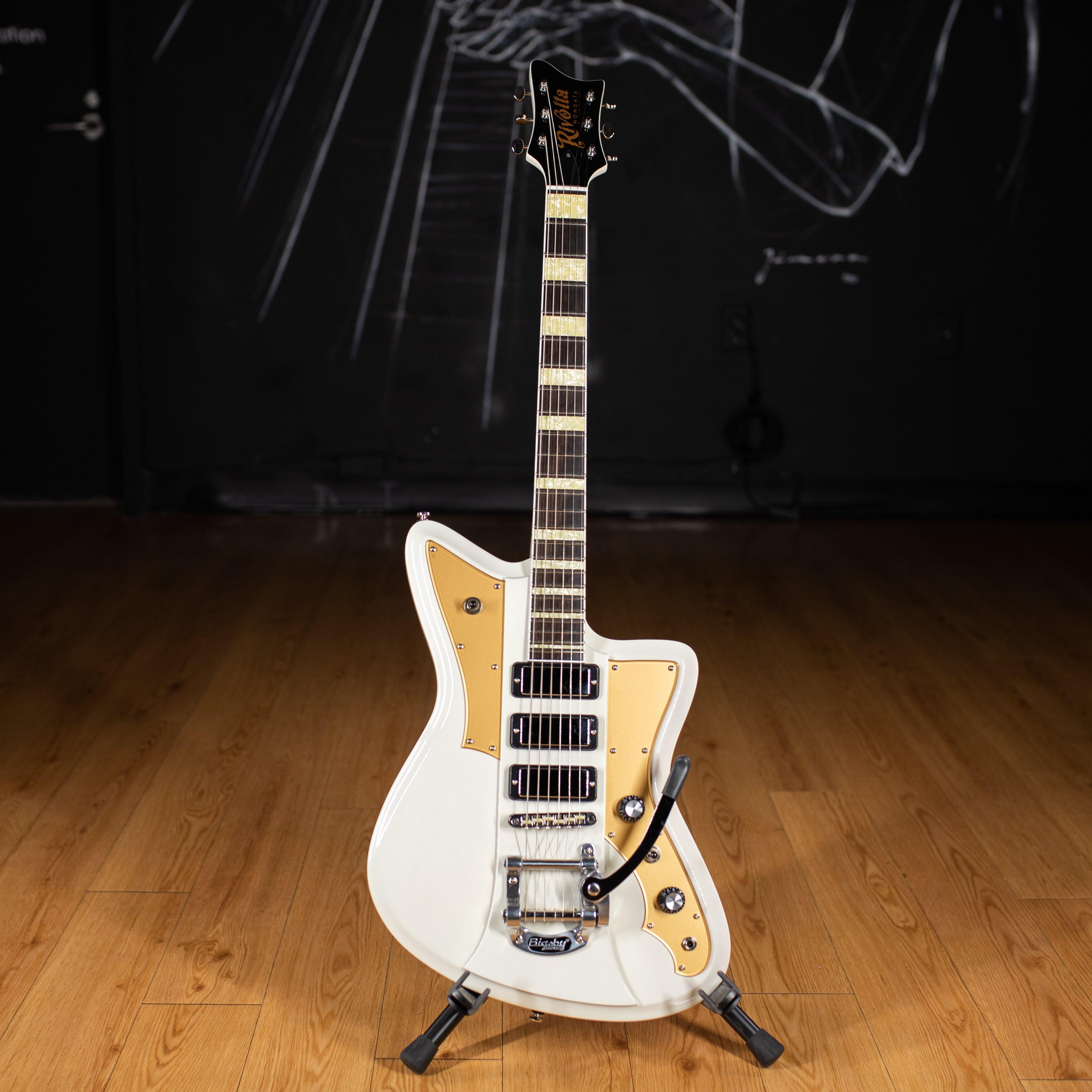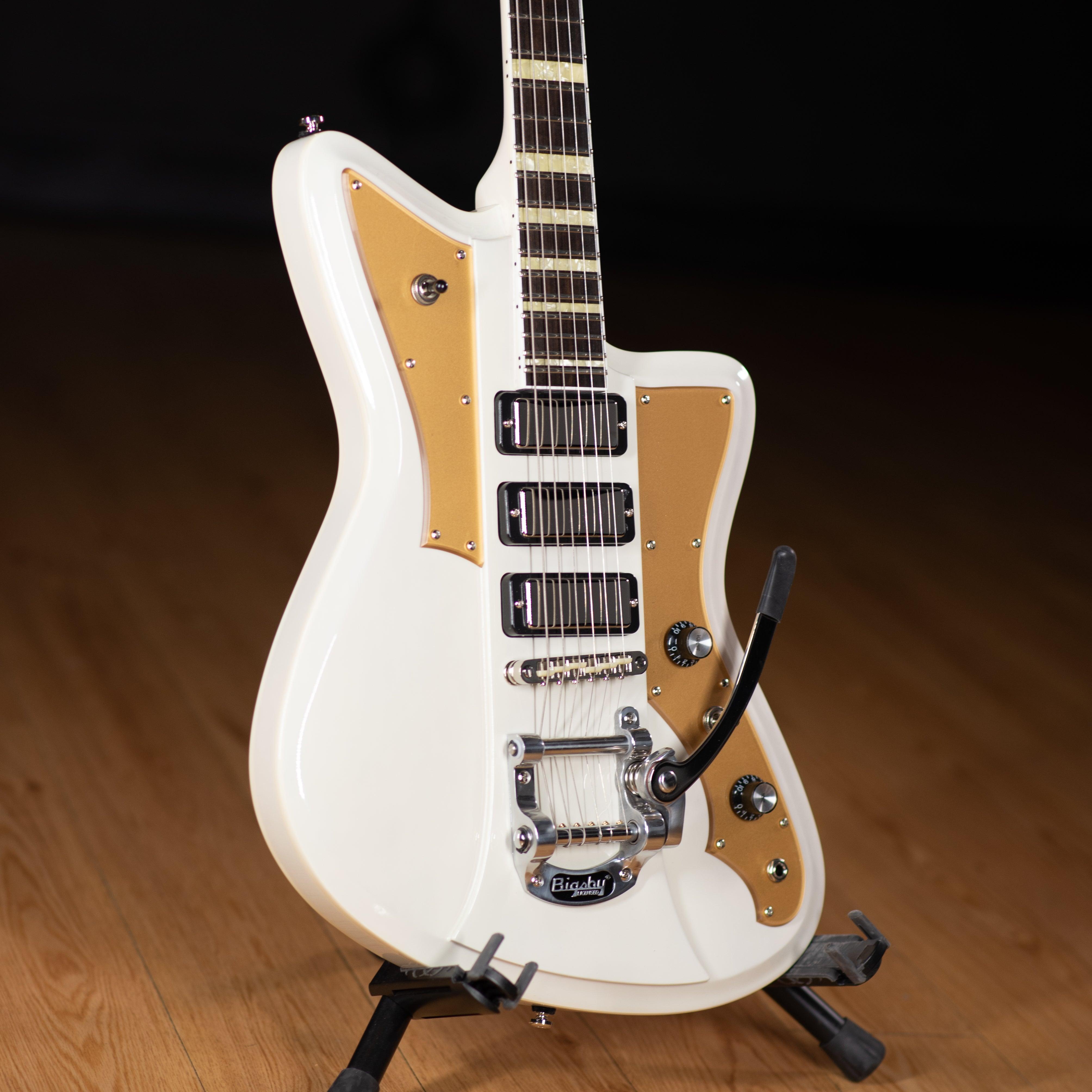 Al igual que la Combinata, la MONDATA presenta un cuerpo de caoba con cámara de doble ribete con mástil ribeteado e incrustaciones de bloques perlados vintage. Esta versión DLX también incluye un B-50 Bigsby.