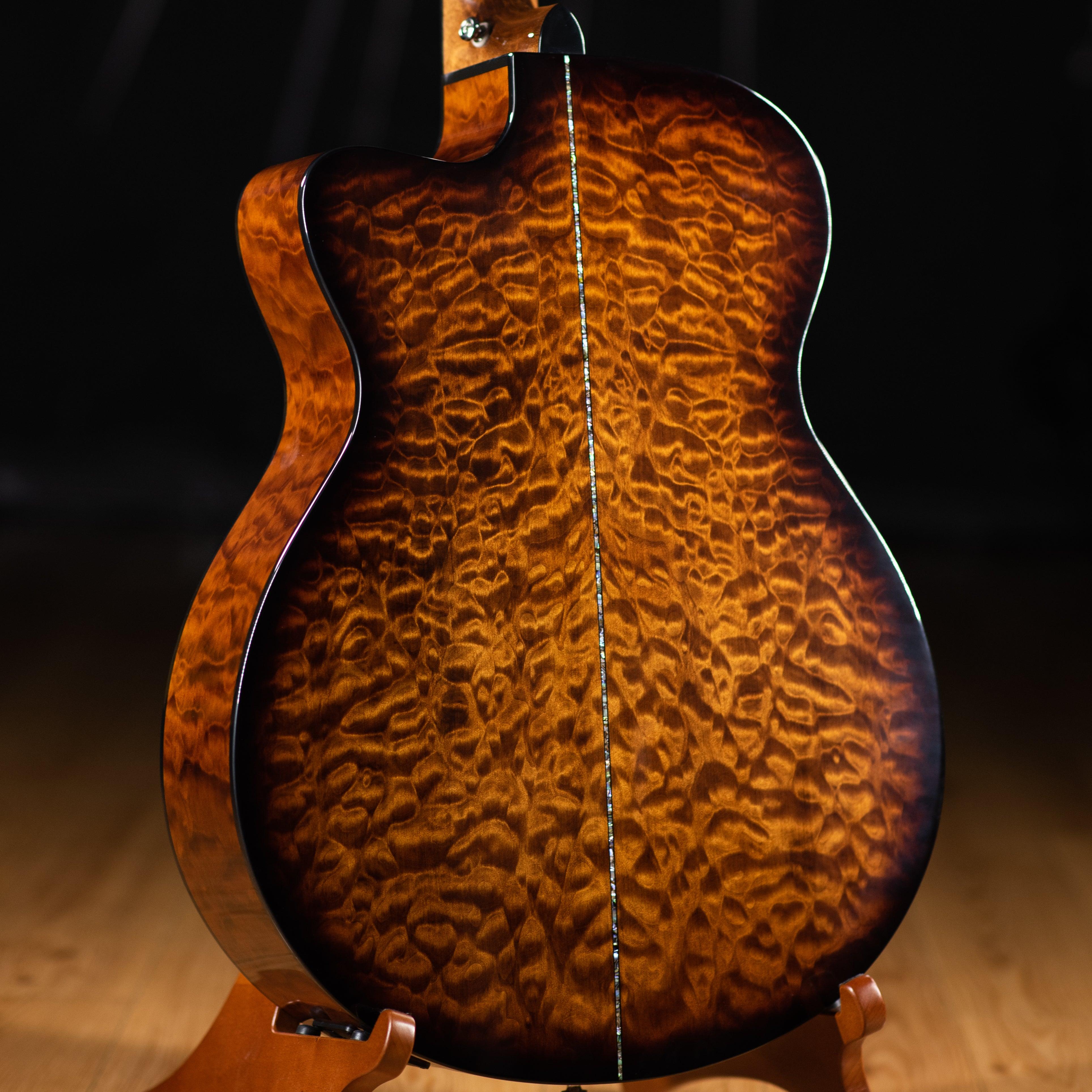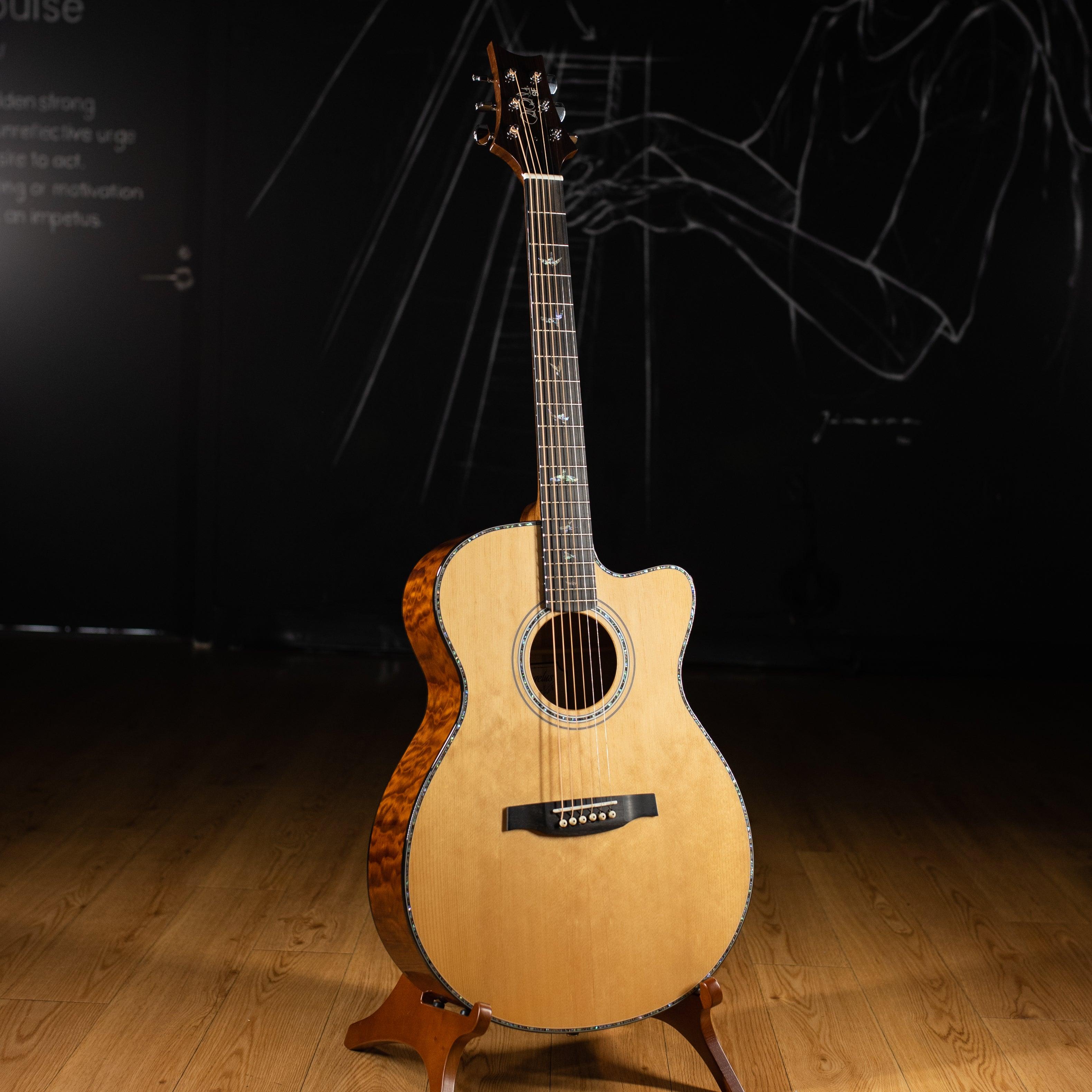 The PRS SE A55E pairs quilted maple back and sides with a solid spruce top for stunning warmth and depth. When matched with PRS hybrid“X”/Classical bracing, which allows the top to freely vibrate and project, the SE A55E has an uncommon 3-dimensional character for a maple back and side guitar. The Angelus Cutaway body shape delivers comfort and playability, well suited for picking and fingerstyle playing.
