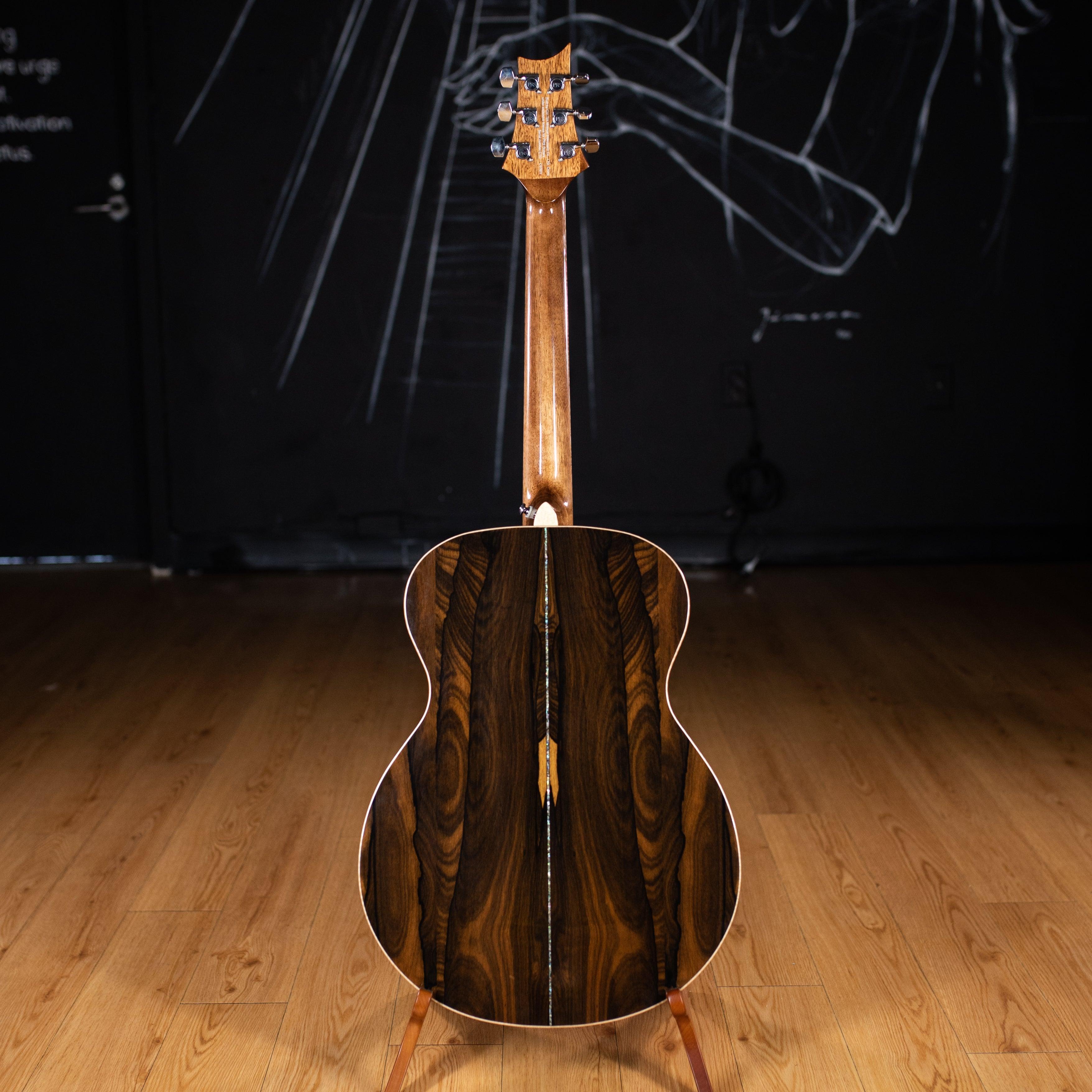 The PRS SE T60E pairs ziricote back and sides with a solid spruce top. The tone favors a full bottom end with rolled-off highs reminiscent of some vintage acoustic guitars. When matched with PRS hybrid“X”/ Classical bracing, which allows the top to freely vibrate, the SE T60E’s voice projects with breathtaking volume and delicate nuance. The Tonare Grand body shape delivers a familiar feel and a thunderous tone, well suited for picking and fingerstyle playing.