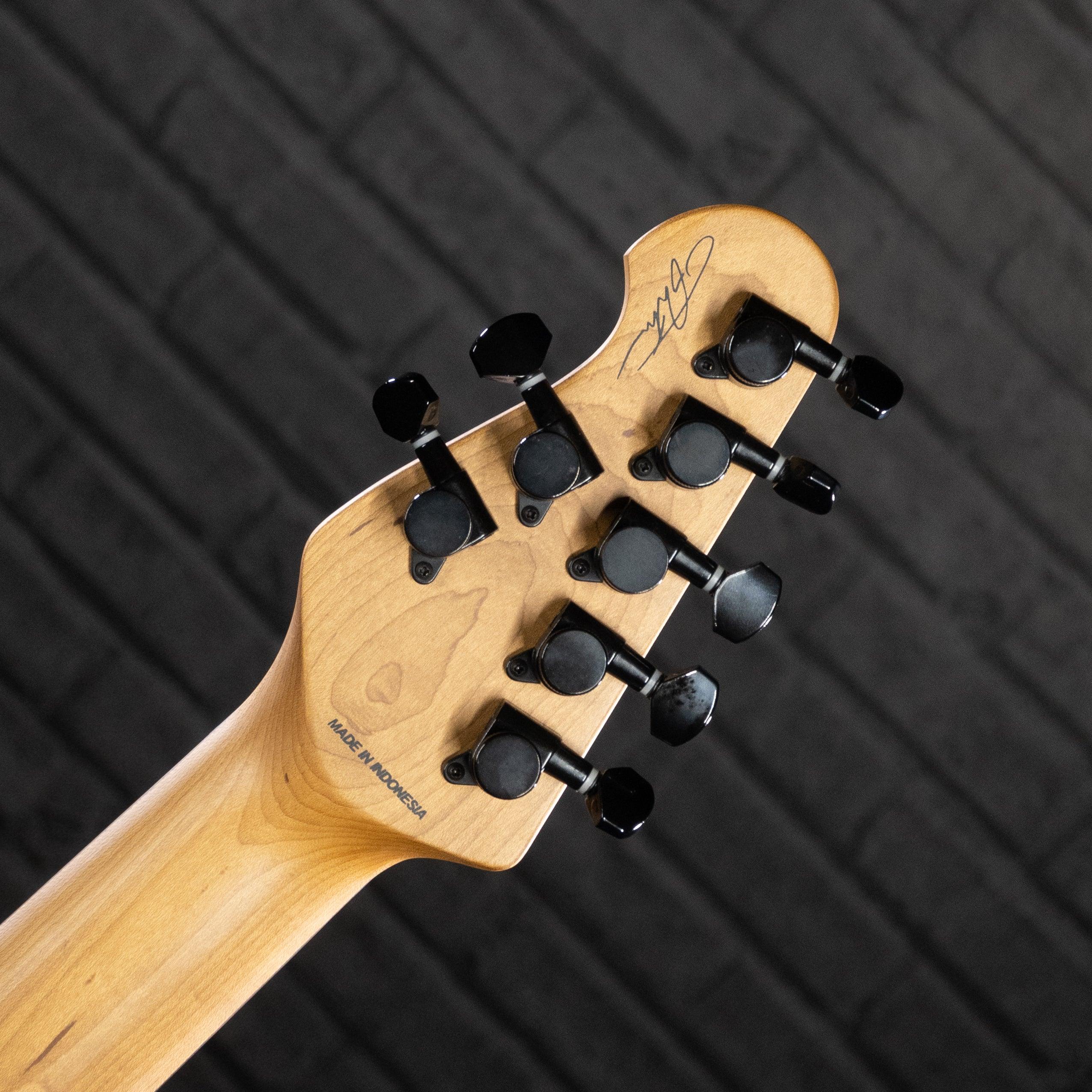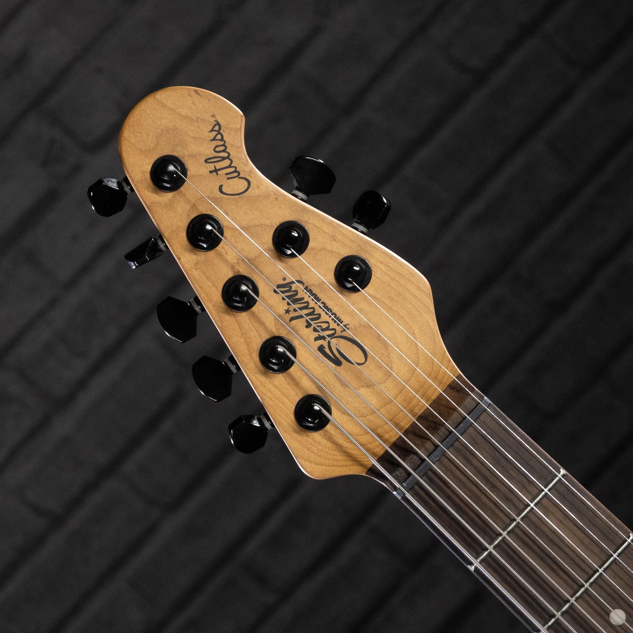 Engineered specifically to meet the demands of Jason Richardson’s technique, the 7-string Richardson7 features a custom contoured lower horn for fret access, roasted maple neck with rosewood fretboard, and highly figured Poplar Burl top. The guitar also offers high output Sterling by Music Man designed humbuckers, a 12dB push-push volume boost, coil-tap push-push tone control, and modern tremolo.