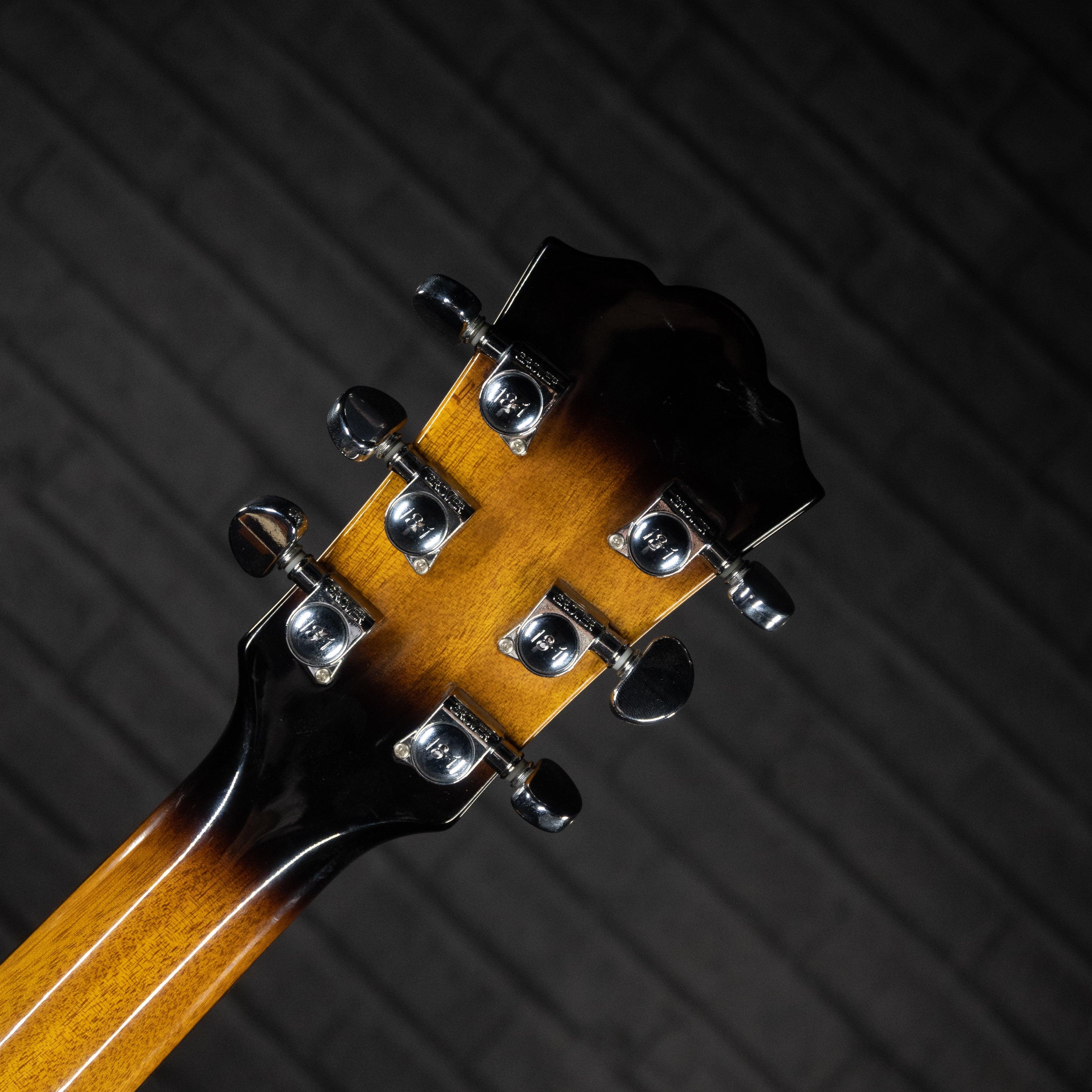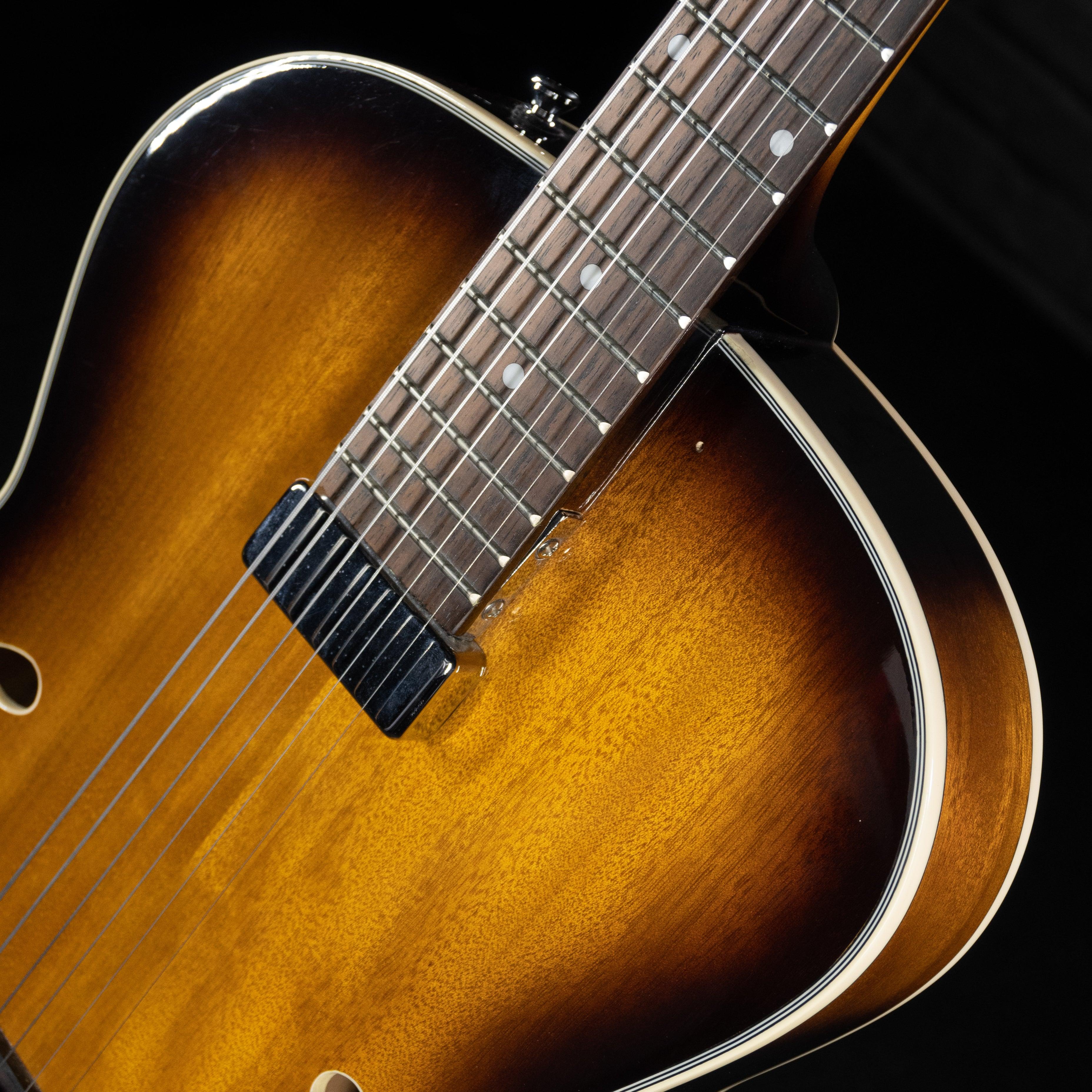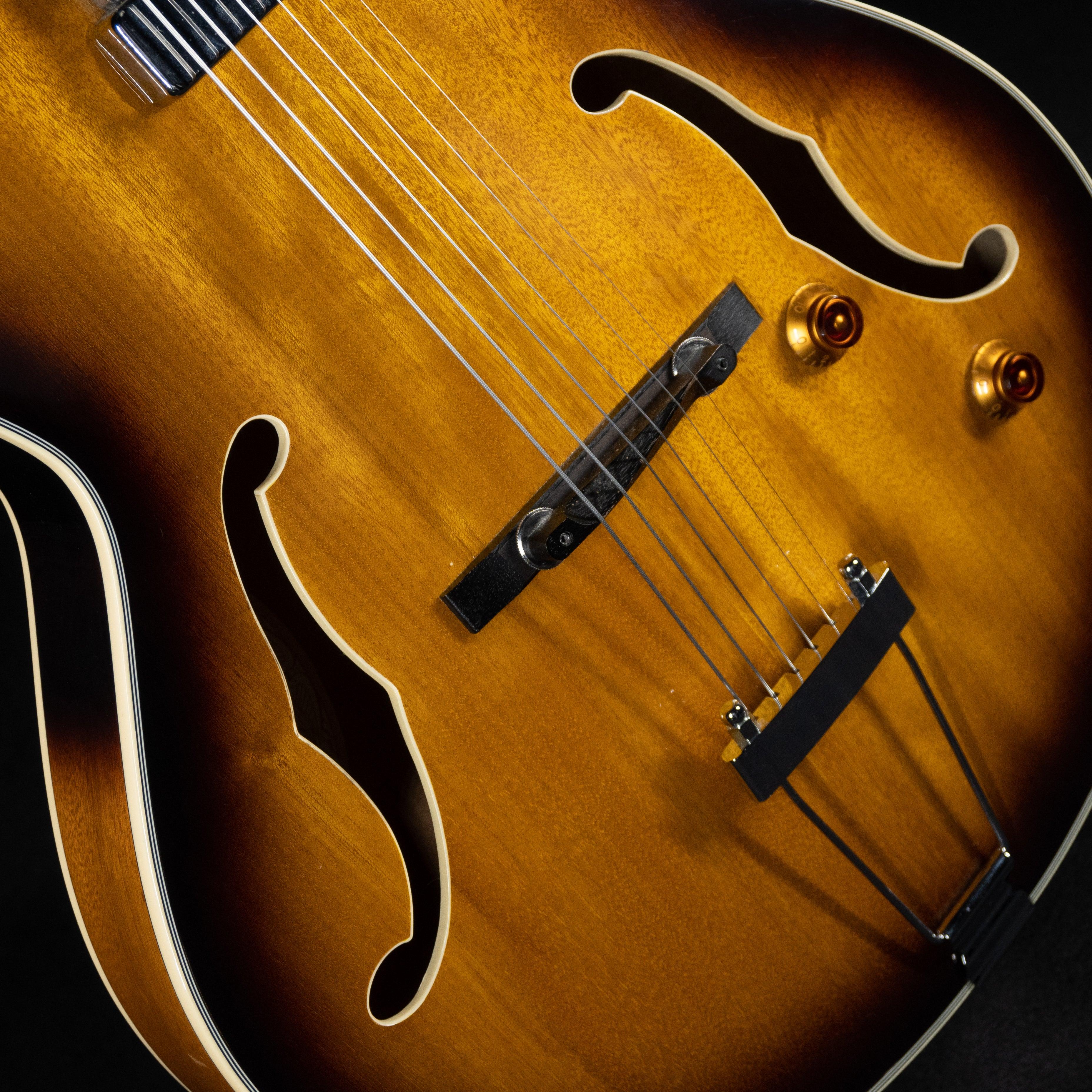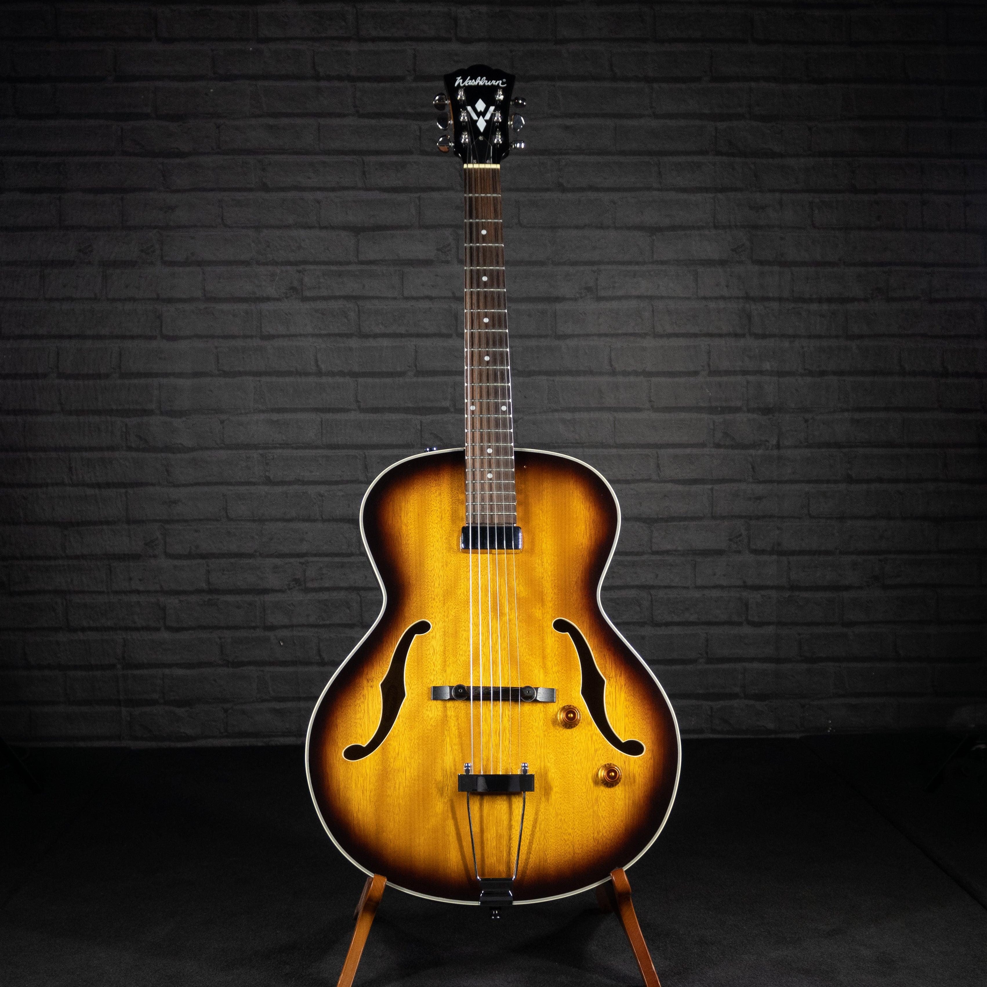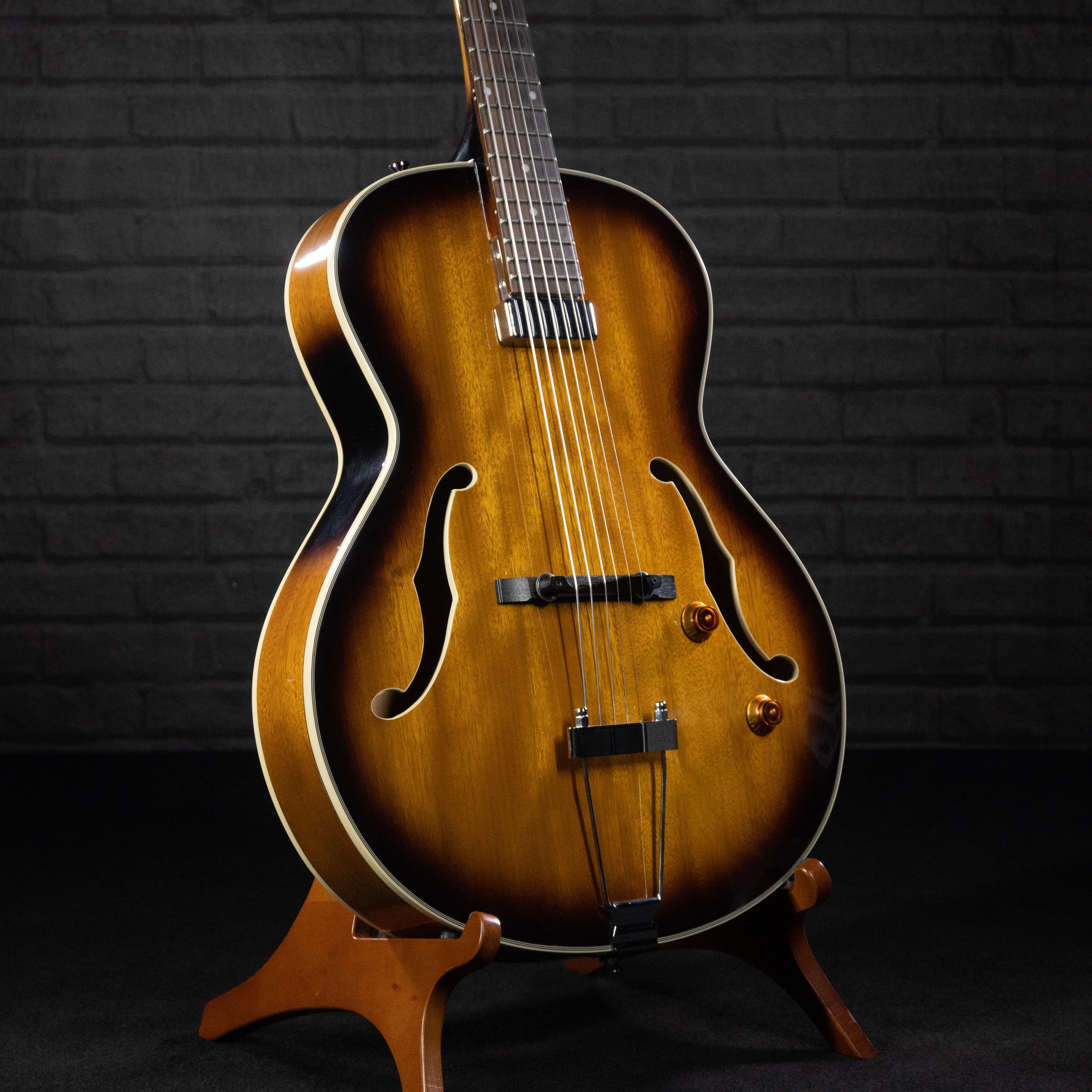 This used and affordable hollow-body guitar with the sound perfect for jazz or blues settings. The pickguard has been removed so the whole gorgeous top is visible as you play.