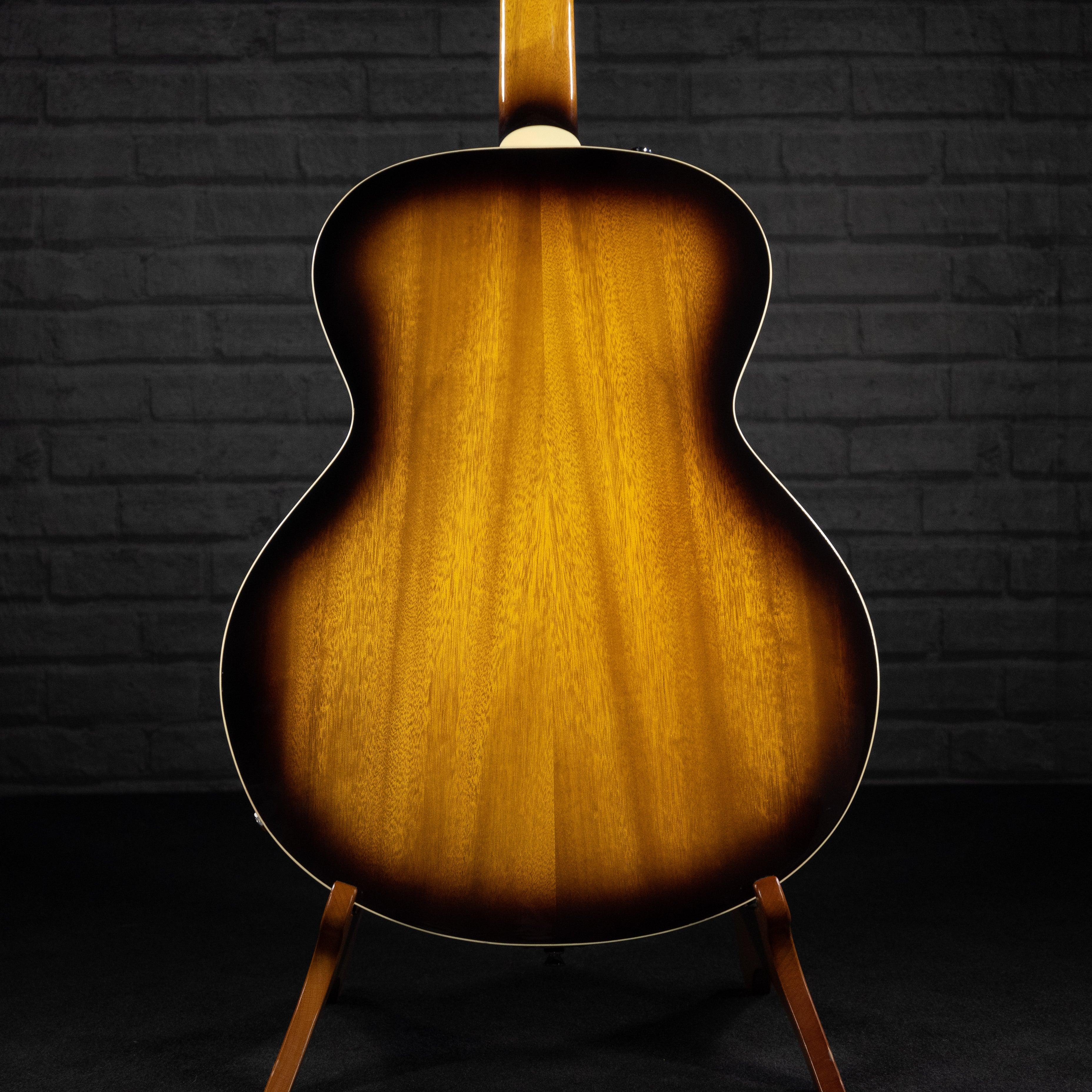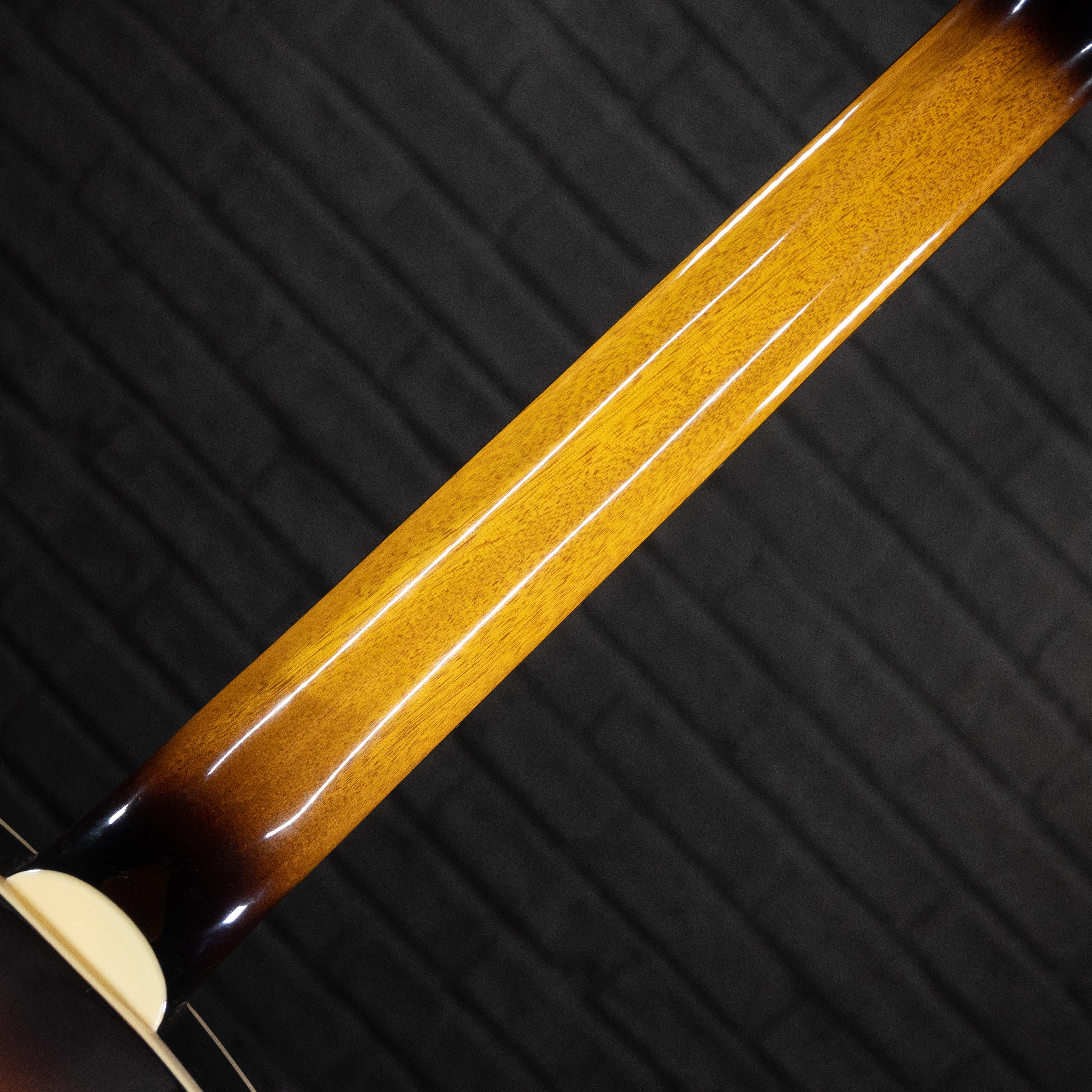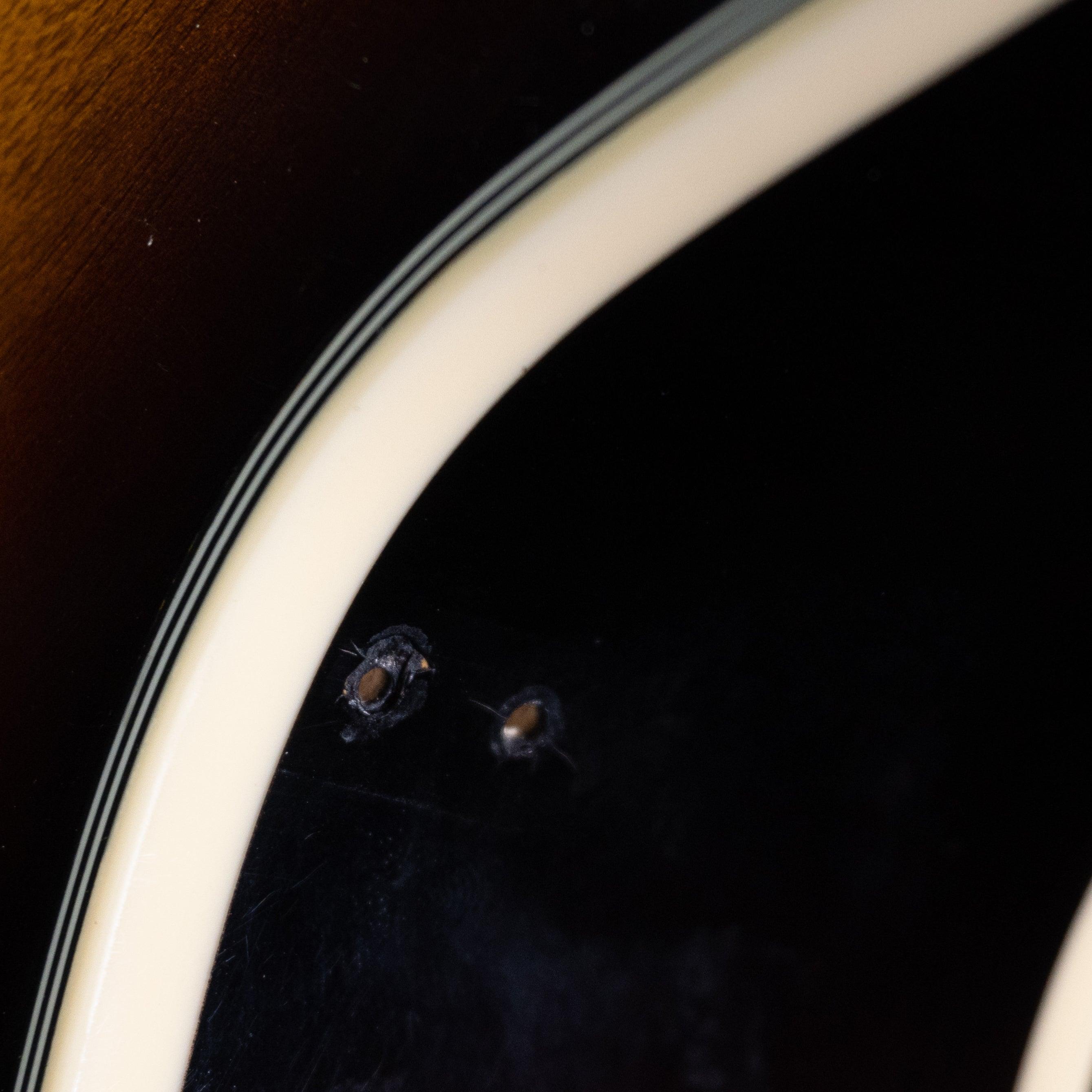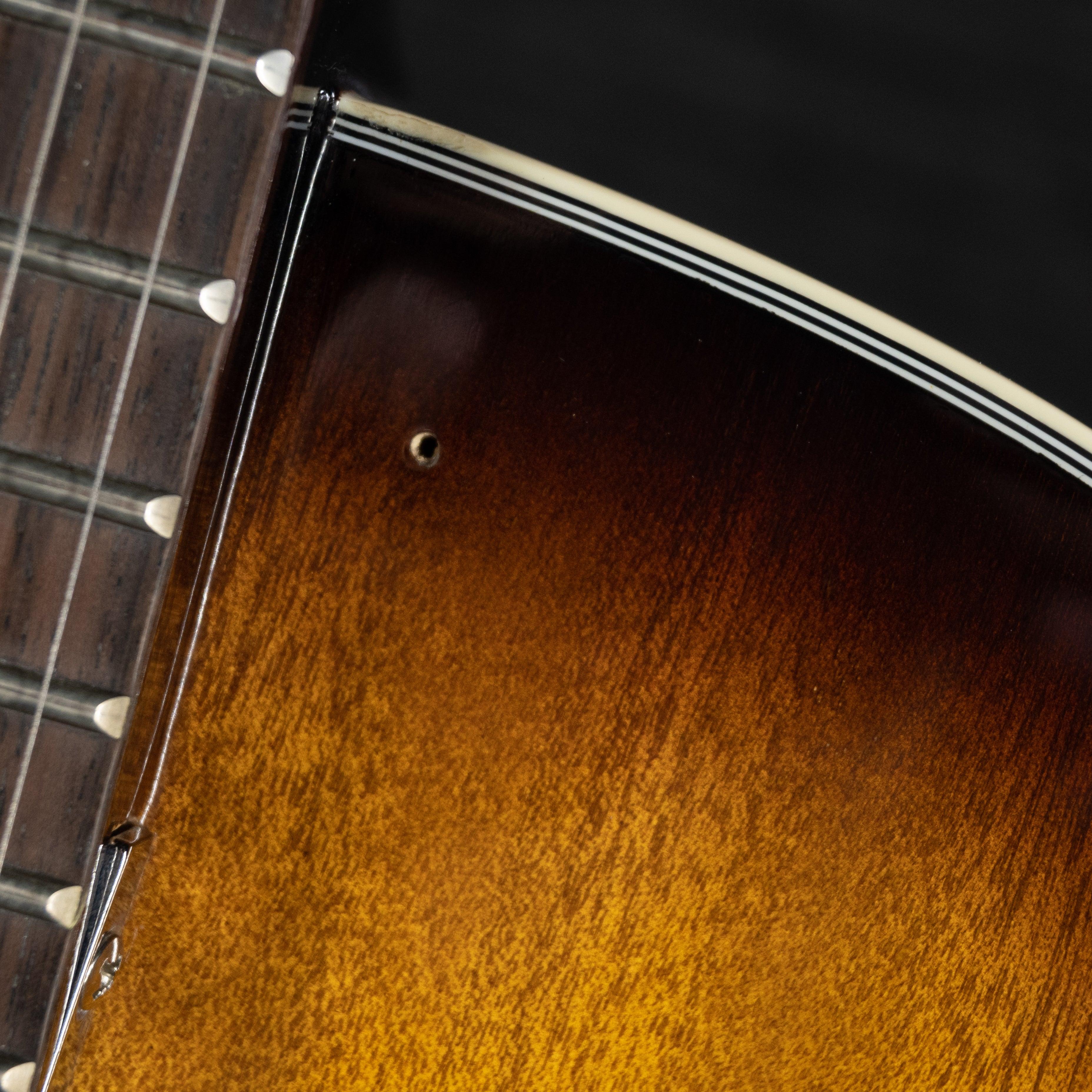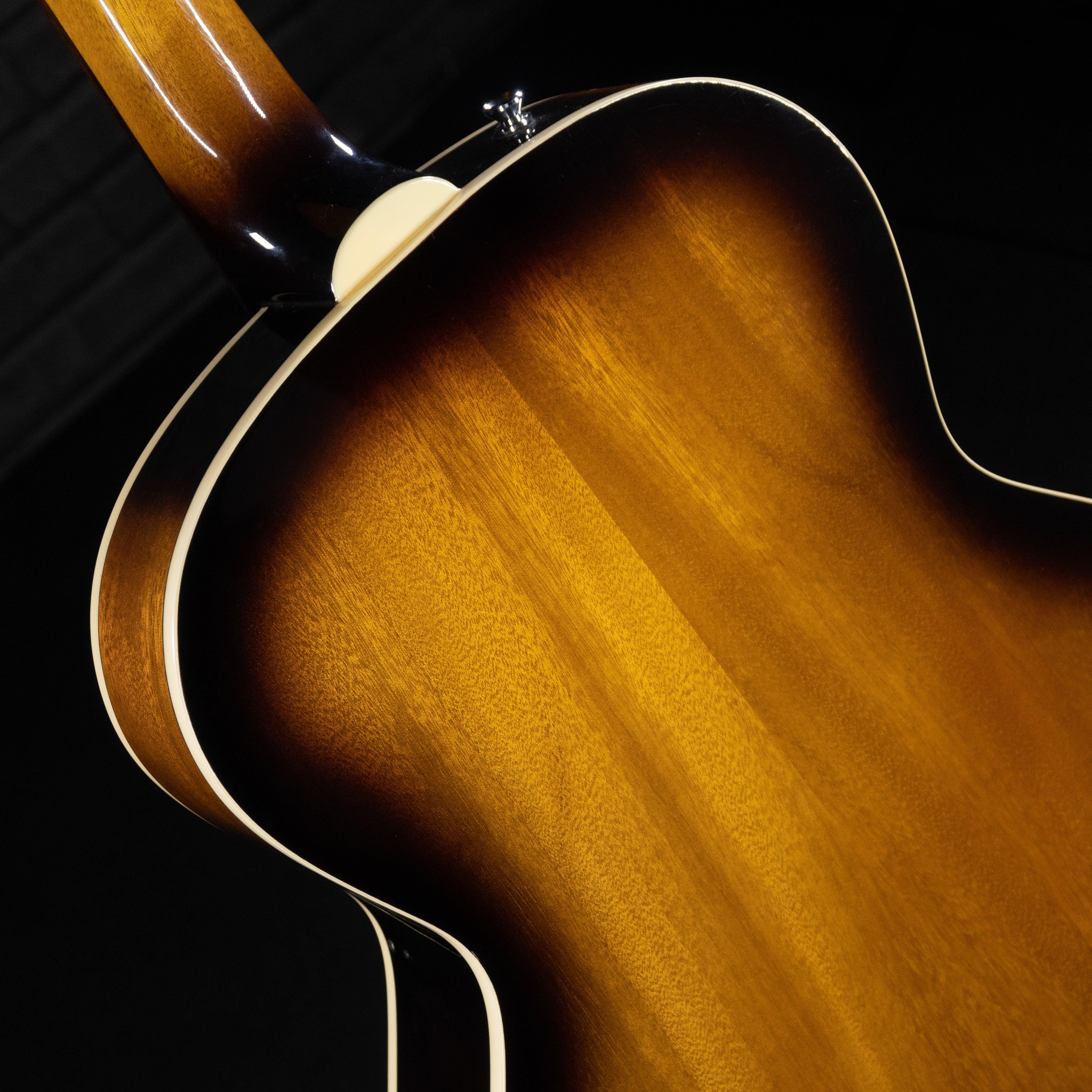 This used and affordable hollow-body guitar with the sound perfect for jazz or blues settings. The pickguard has been removed so the whole gorgeous top is visible as you play.